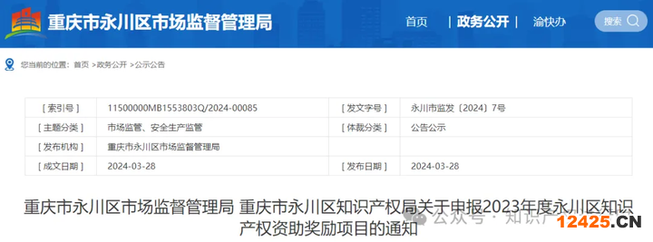 重慶市永川區(qū)市場(chǎng)監(jiān)督管理局 重慶市永川區(qū)知識(shí)產(chǎn)權(quán)局關(guān)于申報(bào)2023年度永川區(qū)知識(shí)產(chǎn)權(quán)資助獎(jiǎng)勵(lì)項(xiàng)目的通知