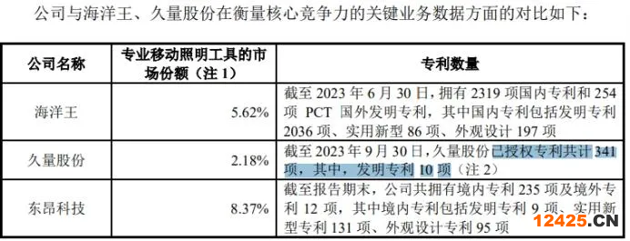 而根據(jù)公司方面披露的數(shù)據(jù),截至2023年6月末,海洋王擁有2319項國內(nèi)專利和254項PCT國外發(fā)明專利;截至2023年9月末,久量股份已授權(quán)專利共計341項,其中,發(fā)明專利10項。從專利數(shù)量看,海洋王與久量股份的專利數(shù)均要明顯高于東昂科技的專利數(shù)量。