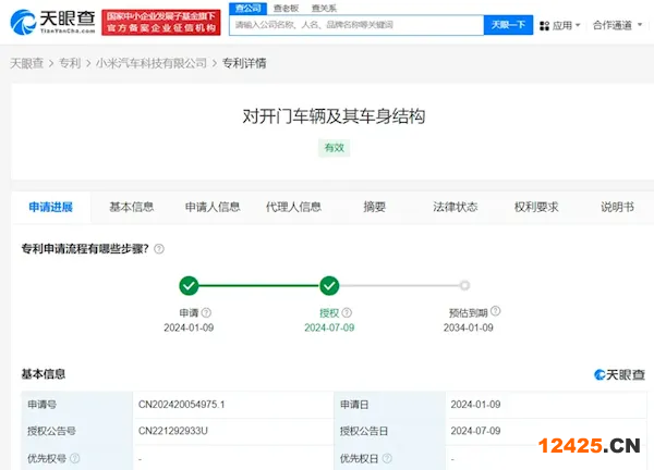 天眼查知識產(chǎn)權(quán)信息顯示,近日,小米汽車科技有限公司申請的“對開門車輛及其車身結(jié)構(gòu)”專利獲授權(quán)。流程信息顯示,該專利申請于今年1月。