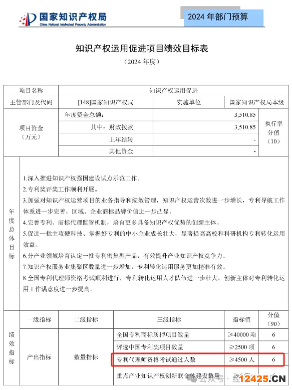 國家知識產(chǎn)權(quán)局2024年部門預(yù)算中《知識產(chǎn)權(quán)運(yùn)用促進(jìn)項(xiàng)目績效目標(biāo)表》中,2024年專利代理師資格考試通過人數(shù)≥4500人