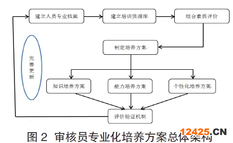 在確定專業(yè)化培養(yǎng)方案之前做好基礎準備工作是必不可少的環(huán)節(jié),首先要建立人員培養(yǎng)檔案和專業(yè)化培訓資源庫;之后要對每位審核員進行綜合的能力素質評價,根據評價結果,針對不同的類別,逐步制定專業(yè)知識培養(yǎng)方案、能力培養(yǎng)方案和個性化培養(yǎng)方案,每套方案均應匹配相應的培養(yǎng)方式和培養(yǎng)效果評價驗證機制,同時這種專業(yè)化培養(yǎng)方案具有針對性、可操作性、能夠充分實踐驗證,對每項方案都規(guī)定了具體的學習內容和學時,并設定了專業(yè)化培養(yǎng)的考核評價機制。其總體架構如圖2.