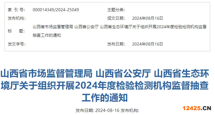 核心提示:8月16日,山西省市場監(jiān)管局、山西省公安廳和山西省生態(tài)環(huán)境廳聯(lián)合下發(fā)通知,將組織開展2024年度省級資質(zhì)認定檢驗檢測機構(gòu)(以下簡稱:檢驗檢