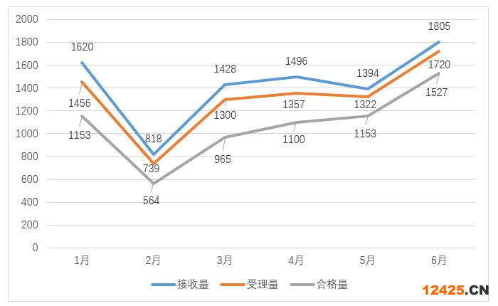 2024年上半年,專利預(yù)審服務(wù)共接收申請(qǐng)8566件,受理7899件,預(yù)審合格6404件。按專利類(lèi)型分,發(fā)明8307件,實(shí)用新型220件,外觀設(shè)計(jì)39件。經(jīng)嚴(yán)格審查,專利預(yù)審合格進(jìn)入國(guó)家知識(shí)產(chǎn)權(quán)局快速審查通道共6311件,其中發(fā)明6177件,實(shí)用新型108件,外觀設(shè)計(jì)26件。平均預(yù)審周期穩(wěn)定在3.5個(gè)工作日左右。2024年上半年每月專利預(yù)審案件量如圖2所示。