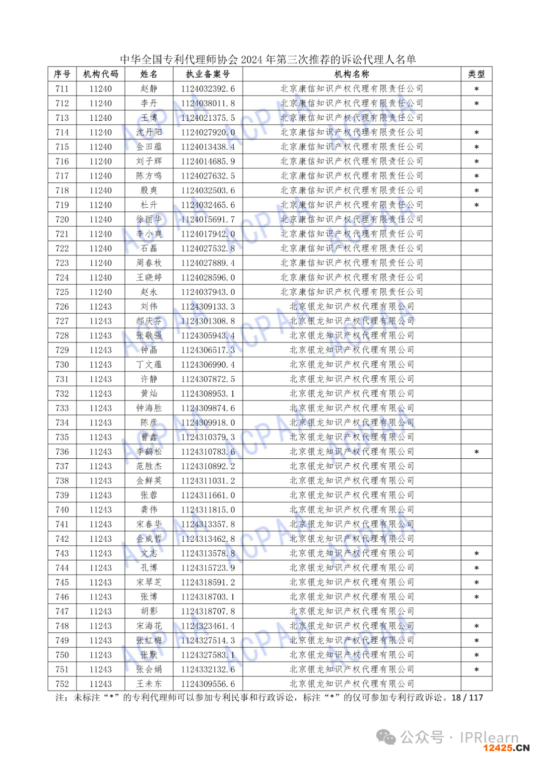 根據(jù)《中華全國專利代理師協(xié)會訴訟代理管理辦法(修訂)》(全專協(xié)〔2023〕002號)的規(guī)定,現(xiàn)公布2024年第三次推薦的訴訟代理人名單(詳見附件1),該名單自2024年10月1日至2024年12月31日有效。