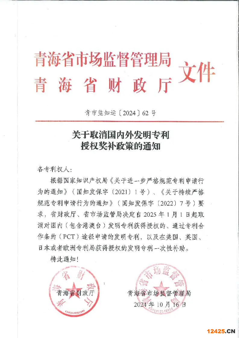 近日,青海省市場監(jiān)督管理局發(fā)布關于取消國內(nèi)外發(fā)明專利授權獎補政策的通知。其中提到,根據(jù)國家知識產(chǎn)僅局《關于進一步嚴格規(guī)范專利申請行為的通知》(國知發(fā)保字 〔2021〕 1號)、《關于持續(xù)嚴格規(guī)范專利申清行為的通如(國知發(fā)保字 〔2022〕 7號)要求,省財政廳、省市場監(jiān)管局決定自2025年1月1日起取消對國內(nèi)(包含港澳臺)發(fā)明專利獲得授權的、通過專利臺作條約(PCT)途徑申請的發(fā)明專利,以及在美國,英國日本或歐洲專利局獲得授權的發(fā)明專利一次性補助。