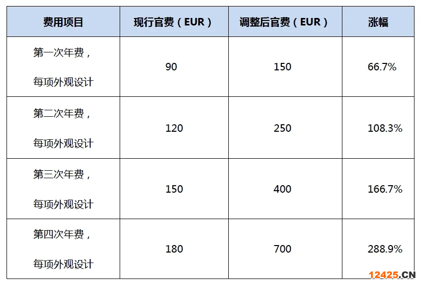 另一個重要變化是歐盟外觀設(shè)計的續(xù)展費和《海牙協(xié)定》國際注冊續(xù)展費用將大幅增加。歐盟外觀續(xù)展費調(diào)整費用如下: