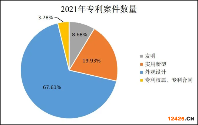其次,根據(jù)2021年浙江知識(shí)產(chǎn)權(quán)司法保護(hù)分析報(bào)告,在2021年,浙江省的專利侵權(quán)案件共4200件,其中發(fā)明專利案件379件,占8.68%;實(shí)用新型專利案件870件,占19.93%;外觀設(shè)計(jì)專利案件2951件,占67.61%[7]。
