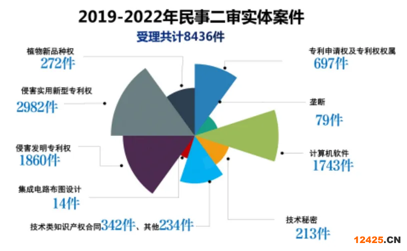 首先,根據(jù)2022年最高人民法院知識(shí)產(chǎn)權(quán)法庭年度報(bào)告,在2019-2022年最高人民法院知識(shí)產(chǎn)權(quán)法庭受理的8436件民事二審實(shí)體案件中,侵害發(fā)明專利權(quán)糾紛1860件,占22%,侵害實(shí)用新型專利權(quán)糾紛2982件,占35.35%[6]