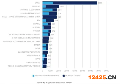 報(bào)告顯示,在深度學(xué)習(xí)領(lǐng)域,百度專利申請(qǐng)量6751件(見(jiàn)下圖),全球排名第一,以顯著優(yōu)勢(shì)領(lǐng)先第二名。這是繼2021年獲得全球第一后,百度再次位居全球第一。