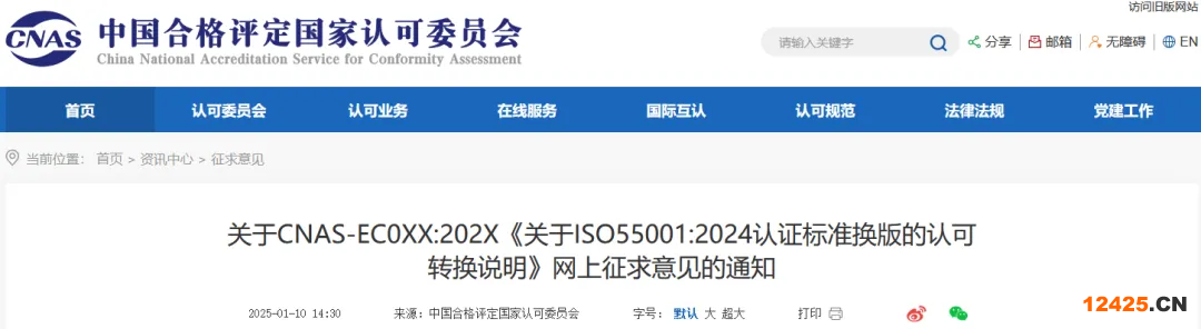 為保證相應轉換工作的有效開展,特制定CNAS—EC 0XX:202X《關于ISO 55001:2024認證標準換版的認可轉換說明》,現(xiàn)已完成文件征求意見稿,在網上公示征求意見。請相關單位和人員對該文件提出修改建議或意見,填寫附件中意見征詢表,并于2025年2月10日前反饋CNAS秘書處。