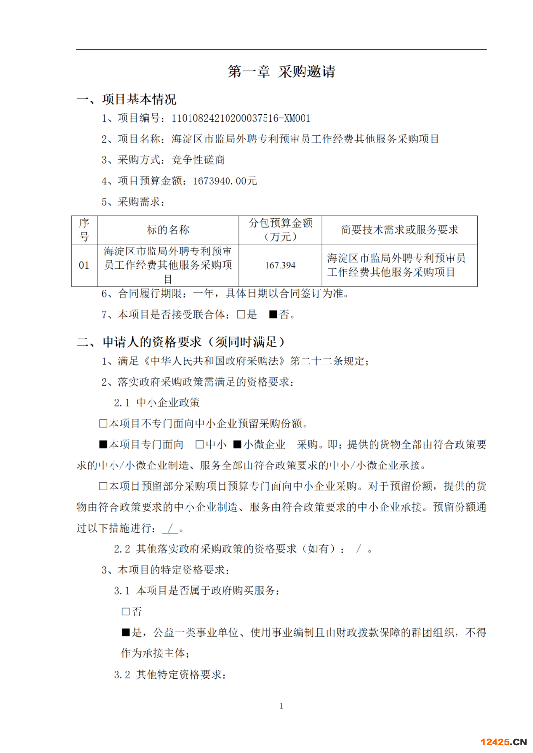 二、項目名稱:海淀區(qū)市監(jiān)局外聘專利預(yù)審員工作經(jīng)費(fèi)其他服務(wù)采購項目
