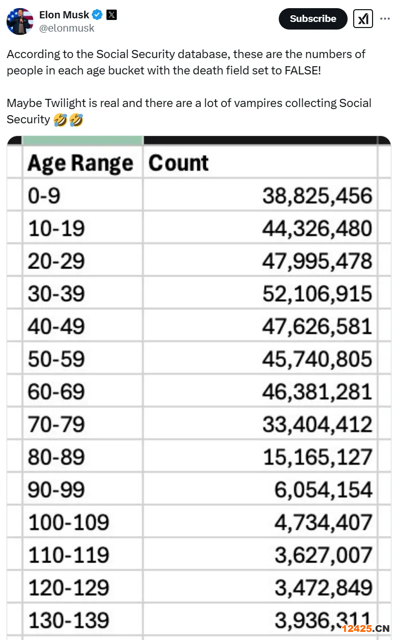 特斯拉CEO埃隆·馬斯克在社交媒體X上拋出一枚“重磅炸彈”——美國(guó)社會(huì)保障系統(tǒng)疑似存在史上最大規(guī)模欺詐行為:超3.94億人領(lǐng)取社保,超美國(guó)3.34億總?cè)丝?其中百歲以上老人竟超過(guò)2000萬(wàn),甚至有人年齡高達(dá)360歲,這遠(yuǎn)遠(yuǎn)早于美國(guó)建國(guó)歷史(1776年)。