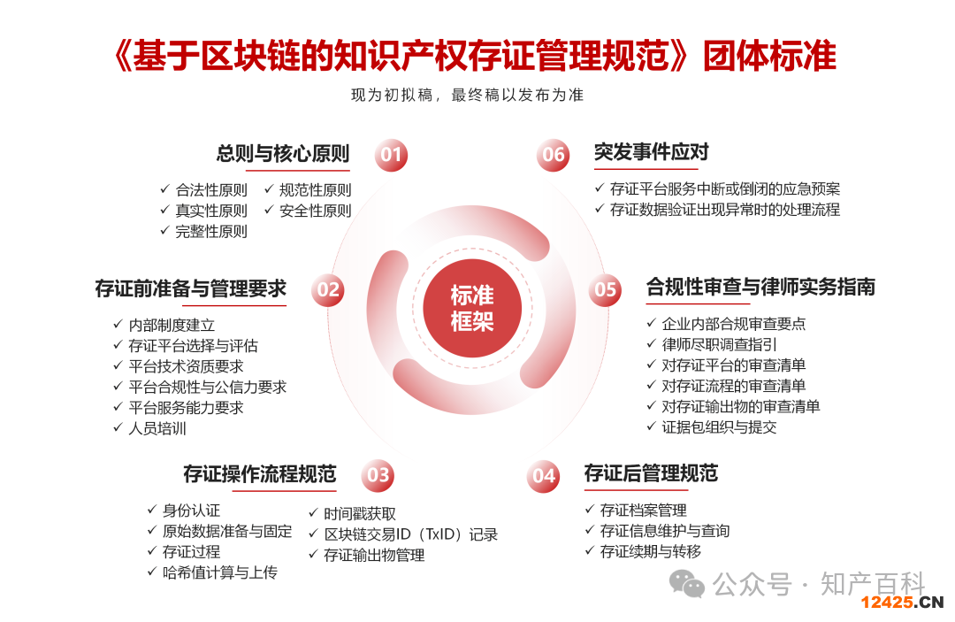上述問題的根源在于存證全流程缺乏統(tǒng)一標準,行業(yè)亟需一套覆蓋“前期準備-中期操作-后期管理”各環(huán)節(jié)的明確操作指引?;诖?,由中國電子商會歸口管理、智合標準中心組織起草的《基于區(qū)塊鏈的知識產(chǎn)權(quán)存證管理規(guī)范》團體標準應運而生。標準現(xiàn)已正式立項,正在面向全社會征集起草單位、起草人。