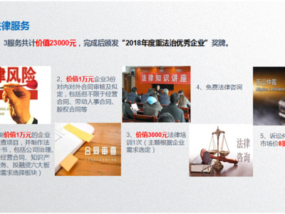 以上服務(wù)共計價值23000元,完成后頒發(fā)“2018年度重法治優(yōu)秀企業(yè)”獎牌。另更有兩項(xiàng)超值優(yōu)惠: