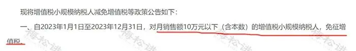 自2023年1月1日至2023年12月31日,對月銷售額10萬以下(含本數(shù))的增值稅小規(guī)模納稅人,免征增值稅。