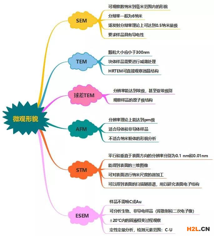 形貌分析方法主要有:掃描電子顯微鏡(Scanningelectron microscopy, SEM)、透射電子顯微鏡(Transmission electron microscopy, TEM)、原子力顯微鏡(Atomic force microscopy, AFM)和掃描隧道顯微鏡(Scanning tunneling microscopy, STM)等等,詳見下圖。
