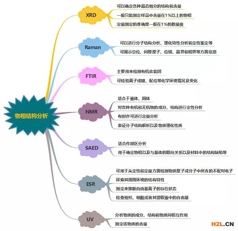 常用的物相分析方法有X射線衍射分析、激光拉曼分析、傅里葉紅外分析以及微區(qū)電子衍射分析等等,詳見下圖。