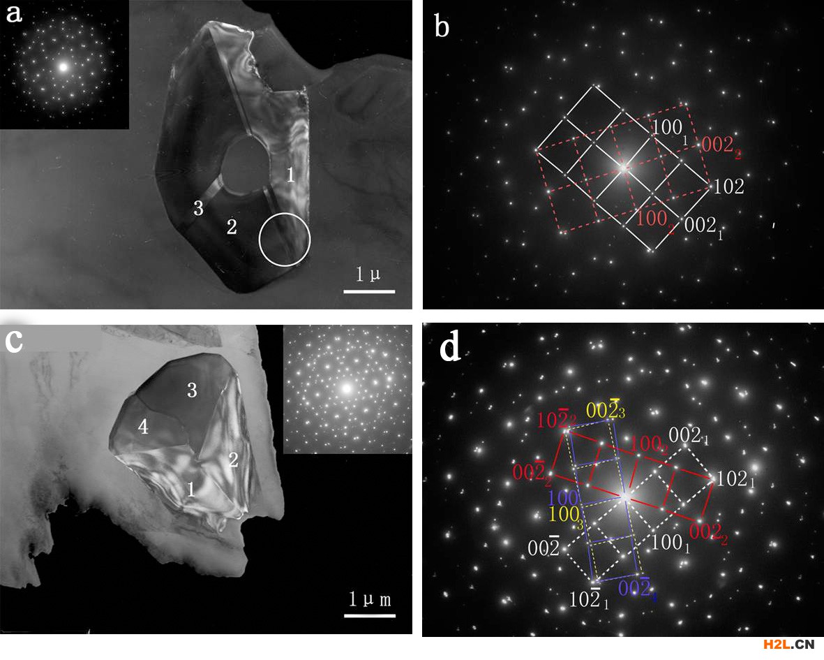 上圖中圖a和b是CaMgSi相中的(102)孿晶在不同位向下的孿晶花樣,圖c是CaMgSi相中另外一種孿晶的電子衍射花樣,其孿晶面是(011)面;圖d是鎂中常見的(10-12)孿晶花樣。
