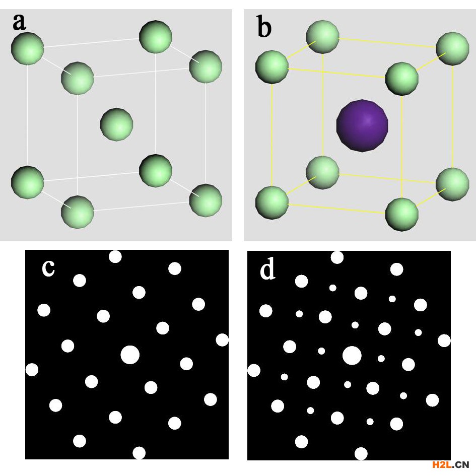 上圖是CsCl無序和有序的模型和對(duì)應(yīng)的電子衍射花樣。其中圖a是CsCl無序時(shí)的晶體結(jié)構(gòu)模型,而圖b是有序時(shí)的晶體結(jié)構(gòu)模型;圖c是與無序?qū)?yīng)的電子衍射花樣示意圖,而圖d則是與有序?qū)?yīng)的超點(diǎn)陣電子衍射花樣示意圖?!?/p>