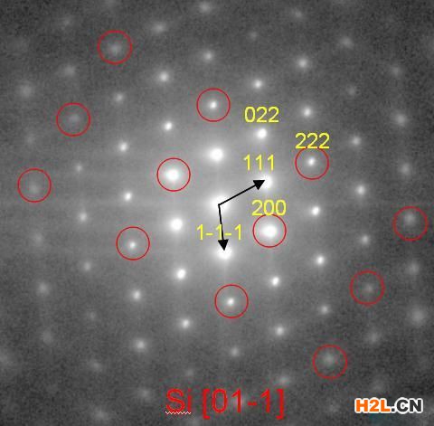 典型的例子:硅的電子衍射花樣,圖中紅圈內(nèi)的衍射應(yīng)該是系統(tǒng)消光的。但(200)可以是(111)衍射電子再發(fā)生(1-1-1)衍射的總的效果。這一現(xiàn)象被稱為二次衍射或動(dòng)力學(xué)衍射。同理,消光的(222)也可以由兩次(111)來產(chǎn)生。(200)也可以通過(111)+(111)+(0-2-2)來產(chǎn)生,只是這種多次衍射的幾率更低一些罷了。