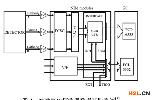氣體探測器將測到的X射線散射信號轉(zhuǎn)換成電荷脈沖信號,經(jīng)前置放大器(AMP)放大后,再經(jīng)甄別器(DISC)對每個脈沖信號進(jìn)行甄別,即過濾掉振幅小于域值的脈沖信號,并將有效脈沖信號轉(zhuǎn)換為標(biāo)準(zhǔn) NIM 信號。標(biāo)準(zhǔn) NIM 信號經(jīng)時間-數(shù)字轉(zhuǎn)換器(TDC)轉(zhuǎn)換成位置數(shù)字信號。多路器(MUX/CTR)將位置信號及脈沖計數(shù)結(jié)合再通過 PCI-6533 計數(shù)卡送到顯示器。