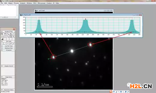 11.對(duì)于某些儀器測(cè)試的結(jié)果在用DM處理時(shí),測(cè)量衍射點(diǎn)到中心距離時(shí)會(huì)直接顯示長(zhǎng)度(nm-1),這種情況下不需要標(biāo)尺標(biāo)定,直接測(cè)量距離,然后求倒數(shù)即可得到對(duì)應(yīng)衍射晶面晶面間距。如下圖所示: