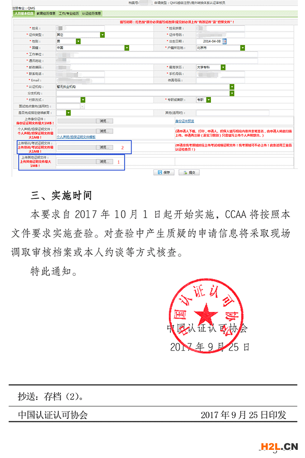 本要求自 2017 年 10 月 1 日起開始實施,CCAA 將按照本文件要求實施查驗。對查驗中產生質疑的申請信息將采取現(xiàn)場 調取審核檔案或本人約談等方式核查。
