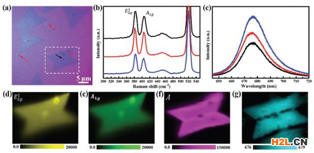 圖示:(a)MoS2多邊形微片的光學(xué)顯微成像;(b, c)在圖(a)白框范圍內(nèi)取點(diǎn)測試的拉曼和PL光譜譜圖;(d, e)E12g和A1g模式吸收強(qiáng)度的拉曼映射圖像;(f, g)PL的強(qiáng)度映射和峰值漂移映射圖像。