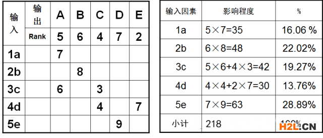 下圖是X-Y矩陣圖,其中abcde為輸入因素,ABCDE為輸出因素,A因素影響重要度為5,B為6,C為4,D為7,E為2;請確定a、b、c、d、e輸入因素的影響順序。