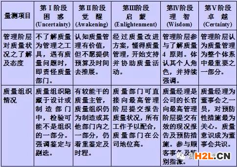 核心提示:克勞士比從長(zhǎng)期的質(zhì)量實(shí)踐中,將質(zhì)量管理成熟度總結(jié)為5個(gè)階段,每個(gè)階段對(duì)應(yīng)6個(gè)領(lǐng)域。質(zhì)量管理者可以通過(guò)認(rèn)證研究這些領(lǐng)域,從而
