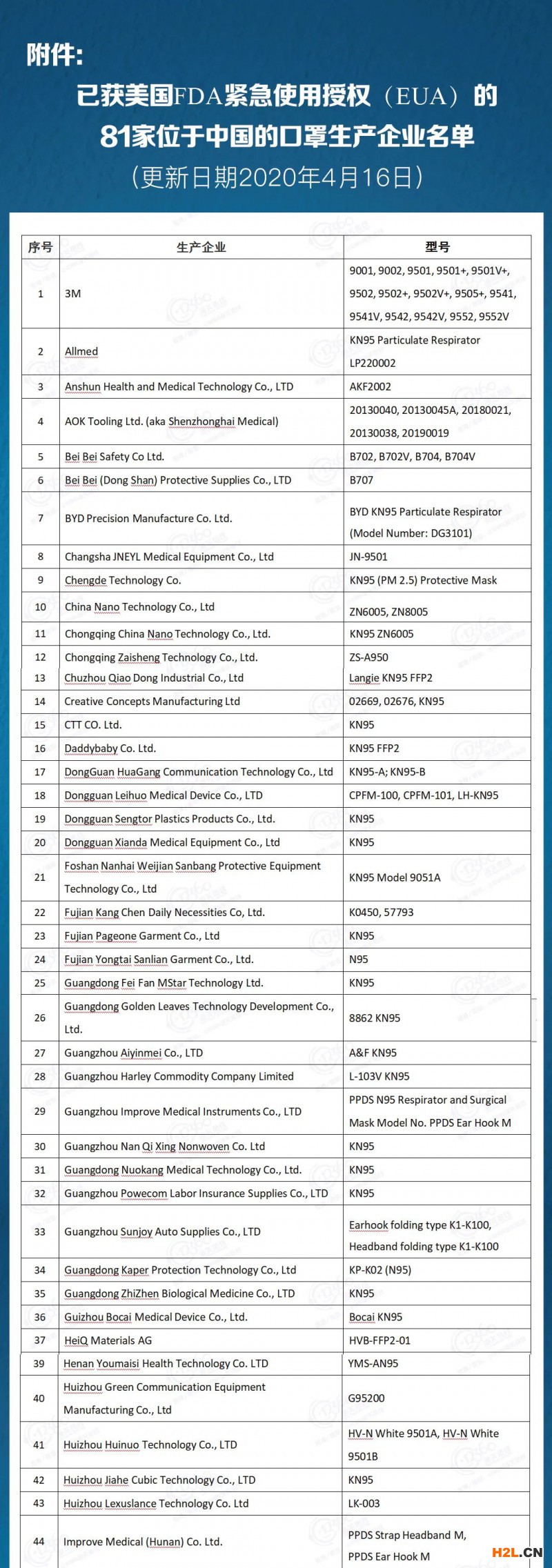 為解決抗擊疫情過程中出現(xiàn)的口罩短缺問題,2023年3月24日,美國食品藥品監(jiān)督管理局(FDA)簽發(fā)了針對非NIOSH批準(zhǔn)的一次性過濾防護口罩(FFR)的緊急使用授權(quán)(EUA),以簡化流程,縮短批準(zhǔn)時間。4月3日,F(xiàn)DA發(fā)布了新的針對中國生產(chǎn)的非NIOSH批準(zhǔn)的一次性過濾防護口罩的EUA。