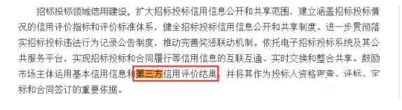 此外,國務(wù)院印發(fā)的《社會信用體系建設(shè)規(guī)劃綱要(2014—2023年)》中要求:“加強招投標領(lǐng)域信用體系建設(shè),鼓勵將第三方信用報告評價結(jié)果作為投標人資格審查、評標、定標和合同簽訂的信用報告重要依據(jù)。”