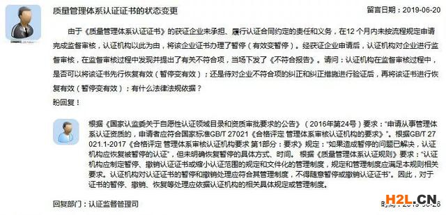 近日,有網(wǎng)友在國家市場監(jiān)督管理總局網(wǎng)站公眾留言系統(tǒng)咨詢關于質(zhì)量管理體系認證證書的狀態(tài)變更問題,市場監(jiān)管總局認證監(jiān)督管理司給予了答復。國家市場監(jiān)管總局公眾留言系統(tǒng)是為廣大從業(yè)人員解答疑問的在線服務平臺,有很多非常有代表性的問題,認證君將選擇大家關注的話題進行發(fā)布,供各位同行參考。