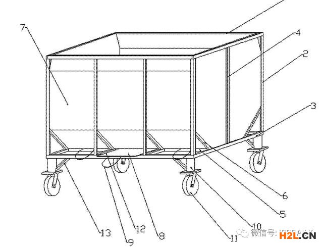 方案概述:該料斗分為外框架2和內(nèi)部料斗7,內(nèi)部料斗7下部呈錐形,方便飼料下落。需要下料時(shí),通過(guò)把手9將推拉擋板8向外拉出即可。