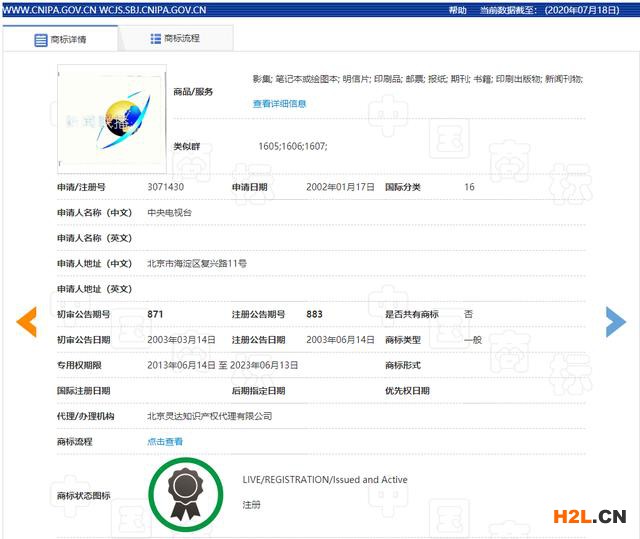 通過如下查詢結(jié)果可以看到,央視只申請了6個商標(biāo),且該6個商標(biāo)是同日申請的位于6個不同類別的同一個圖文商標(biāo)。