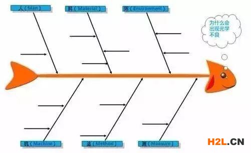 5.將主要原因按照“人、機(jī)、料、法、環(huán)、測”分類,分別填入六個(gè)大骨,然后再逐一討論,找出最可能的原因,進(jìn)行標(biāo)注。