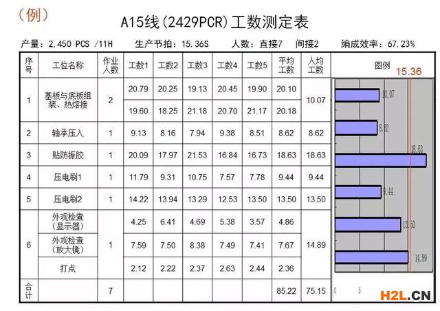⑤做成生產(chǎn)線整體的工數(shù)測定表,計算出各工位的平均工數(shù)和人均工數(shù),并用平衡圖表示。