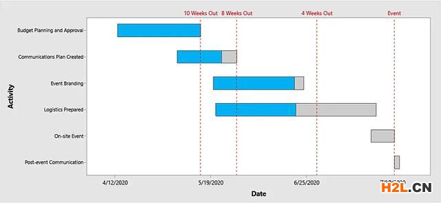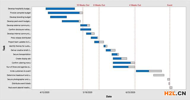 甘特圖可以通過多種方式創(chuàng)建。幸運(yùn)的是,Minitab Workspace提供了兩種不同類型的甘特圖模板,標(biāo)準(zhǔn)的甘特圖(如下所示)和任務(wù)甘特圖,它們是該軟件中90多種工具的一部分。
