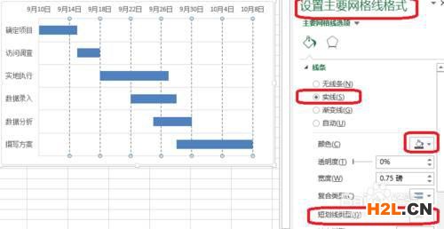 雙擊網(wǎng)格線 - 設(shè)置主要網(wǎng)格線格式 - 實(shí)線 - 顏色 - 短劃線類型(短劃線)。