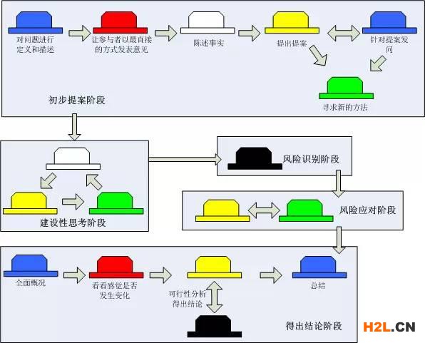 1、陳述問題事實(shí)(白帽) 2、提出如何解決問題的建議(綠帽) 3、評(píng)估建議的優(yōu)缺點(diǎn):列舉優(yōu)點(diǎn)(黃帽);列舉缺點(diǎn)(黑帽) 4、對(duì)各項(xiàng)選擇方案進(jìn)行直覺判斷(紅帽) 5、總結(jié)陳述,得出方案(藍(lán)帽)。