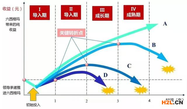 企業(yè)推行六西格瑪一般可以分為四個階段,即導(dǎo)入期、加速期、成長期和成熟期,組織可用4--5年甚至更長的時間完成從導(dǎo)入期到成熟期的全過程。
