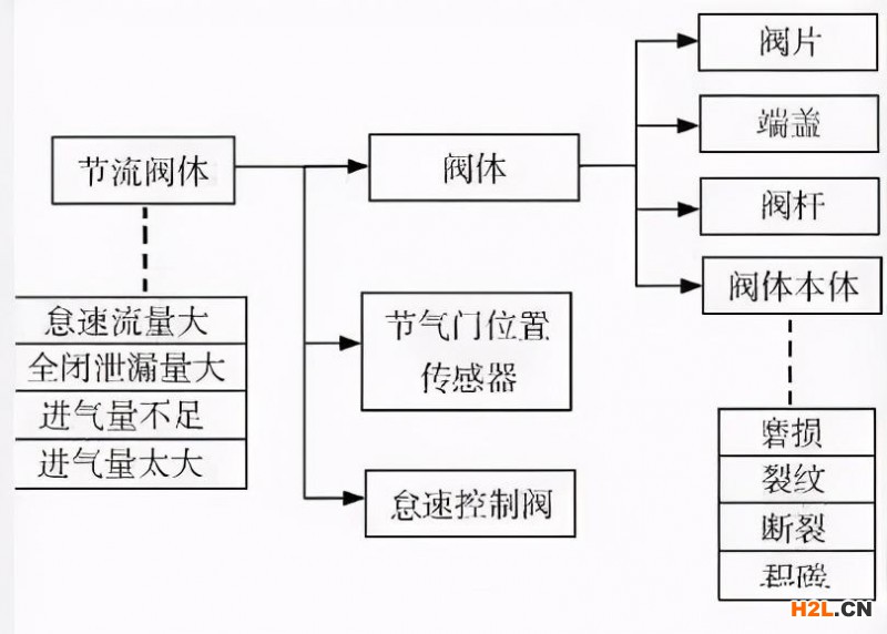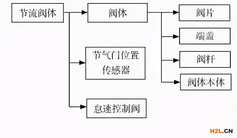 以汽油機的節(jié)流閥體為例,該閥體大致都由閥體、怠速控制閥、節(jié)氣門位置傳感器等組成,細節(jié)部分會有所不同,節(jié)流閥體的系統結構樹如下圖所示。