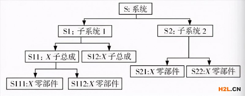 圖中的系統由子系統1和子系統2組成,兩個子系統分別完成相應的功能。子系統1由子總成1和2組成,子總成1又可以向下劃分為零部件;子系統2由兩個零部件組成。其中S12,S21,S22,S111和S112都是該組成結構樹的葉結點。