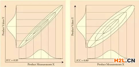 該分布的概率模型可以在XY坐標(biāo)平面中由一系列橢圓表示,下圖顯示了兩個雙變量正態(tài)分布的一,二和三標(biāo)準(zhǔn)偏差等值線,其中組內(nèi)相關(guān)系數(shù)分別為設(shè)定為0.95和0.80。