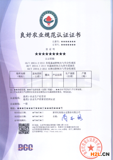 新世紀(jì)認(rèn)證(BCC)良好農(nóng)業(yè)規(guī)范認(rèn)證證書樣式