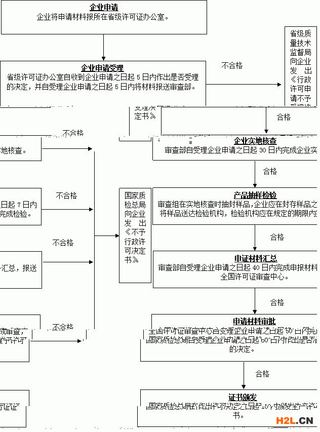 6.企業(yè)實(shí)地核查不合格的判為企業(yè)審查不合格,由省級(jí)許可證辦公室或?qū)彶椴繒?shū)面上報(bào)國(guó)家質(zhì)量監(jiān)督檢驗(yàn)檢疫總局,并由國(guó)家質(zhì)檢總局向企業(yè)發(fā)出《不予行政許可決定書(shū)》。