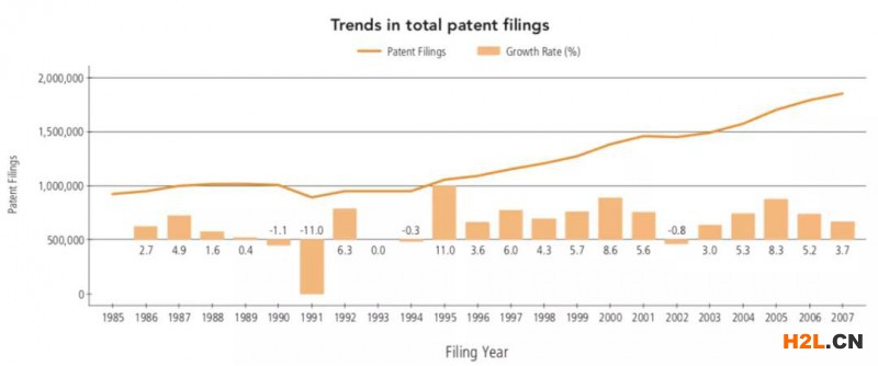 來自WIPO報告:1985-2007年全球?qū)@暾垟?shù)量(1990和1991年負增長是與蘇聯(lián)解體有關(guān))