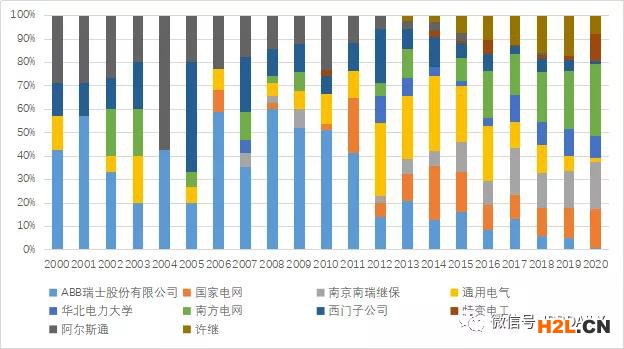 早期的柔性直流輸電技術(shù)基本都掌握在國外同行手中,“卡脖子”現(xiàn)象比較嚴(yán)重,柔性直流輸電系統(tǒng)的建造技術(shù)也主要依賴引進(jìn)輸入。由下圖可以看出,早期柔性直流專利技術(shù)由ABB、西門子、通用、阿爾斯通瓜分,國內(nèi)公司如國家電網(wǎng)、南方電網(wǎng)、南瑞繼保等在08年后開始發(fā)力。