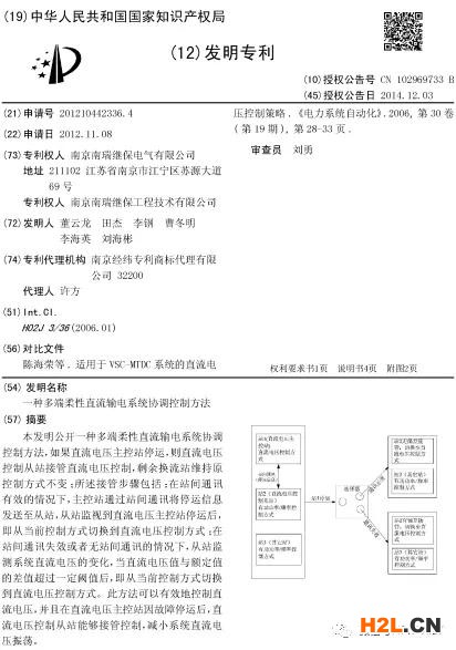 下圖為專利優(yōu)秀獎之一,專利權(quán)人為南京南瑞繼保,該專利涉及一種多端柔性直流輸電系統(tǒng)的協(xié)調(diào)控制方法,與昆柳龍工程一樣都是多端、柔性、直流系統(tǒng),專利所述直流輸電系統(tǒng)包括一個直流電壓主控站、至少一個直流電壓控制從站和至少一個普通換流站,簡單說就是主站+從站+普通站的配置,從站在主站正常工作時,與普通站一樣運(yùn)行有功功率控制方式,在主站不正常時,從站通過一定的判斷規(guī)則接管主站的調(diào)節(jié)功能,并將控制方式切換為直流電壓控制方式,由此減小系統(tǒng)直流電壓振蕩。