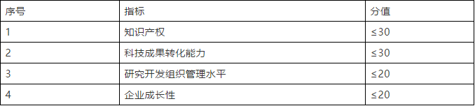 企業(yè)創(chuàng)新能力主要從知識(shí)產(chǎn)權(quán)、科技成果轉(zhuǎn)化能力、研究開(kāi)發(fā)組織管理水平、企業(yè)成長(zhǎng)性等四項(xiàng)指標(biāo)進(jìn)行評(píng)價(jià)。滿(mǎn)分為100分,70分以上(不含70分)為符合認(rèn)定要求。四項(xiàng)指標(biāo)分值結(jié)構(gòu)詳見(jiàn)下表: